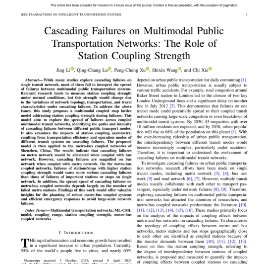近日,智能交通领域国际著名期刊《IEEE Transactions on Intelligent Transportation Systems》(中科院1区、TOP期刊,IF=7.9)刊登了我校beat365英国官方网站博士研究生李静发表的学术成果“Cascading Failures on Multimodal Public Transportation Networks: The Role of Station Coupling Strength”(站间耦合强度在多模式公共交通网络的级联失效中的作用)。李静同学为第一作者,我校路庆昌教授为通讯作者,beat365英国官方网站为第一署名单位和通讯作者单位,同济大学知名学者合作参与完成。该项研究得到了国家自然科学基金重点项目和面上项目的资助。