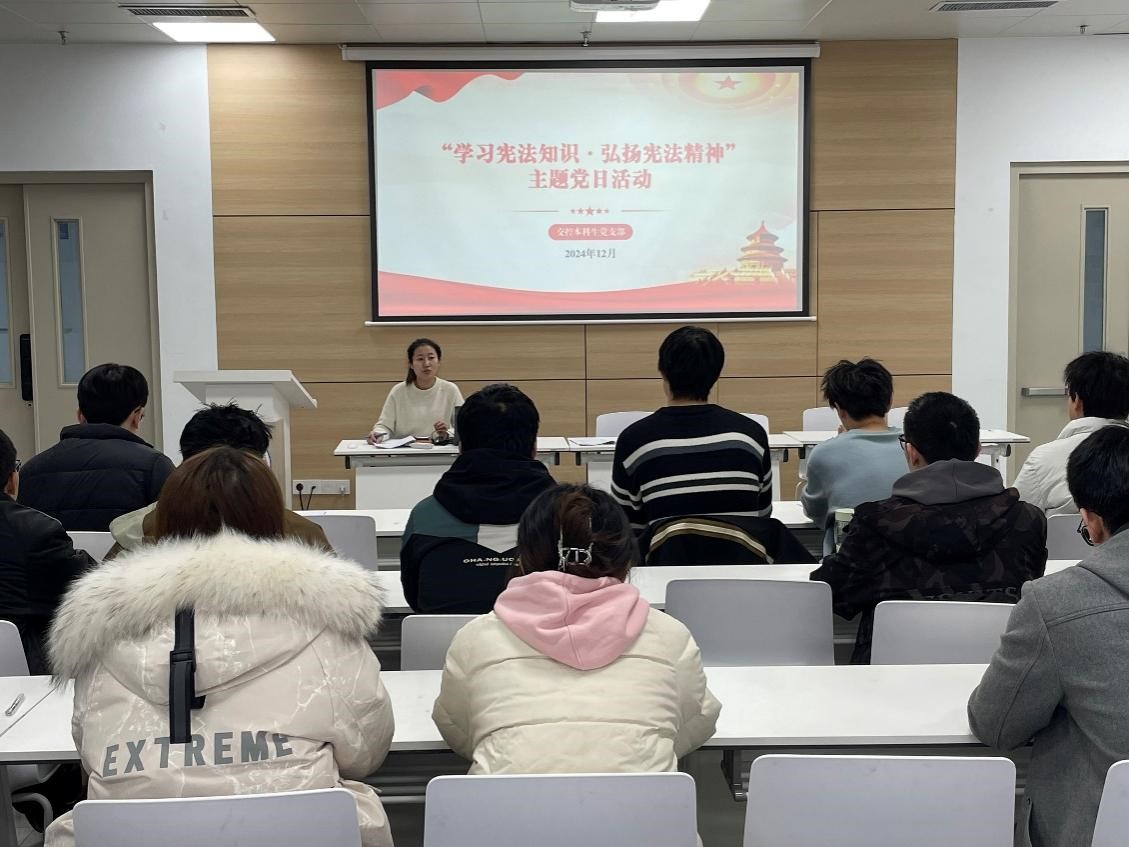 为深入学习宣传贯彻习近平法治思想,大力弘扬宪法精神,着力提升学生党员的法治素养,beat365英国官方网站交控本科生党支部于12月4日在216会议室开展了“学习宪法知识·弘扬宪法精神”主题党日活动。本次活动由党支部书记李慧主持,全体党员参加。