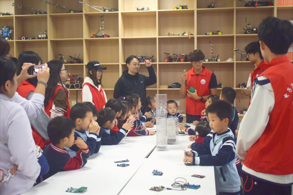 10月10日,beat365英国官方网站科创领航本科生党支部联合院大学生科技创新创业协会、机器人俱乐部与beat365英国官方网站朱雀幼儿园,共同在216室创客基地开展“智慧小齿轮”主题研学活动。支部副书记孙超,科协主席王乐焱,李博祥、周颖莹、张璇、郑泽宇等志愿者,朱雀幼儿园副园长曹蛟、教师代表和大班小朋友共同参与了此次活动。