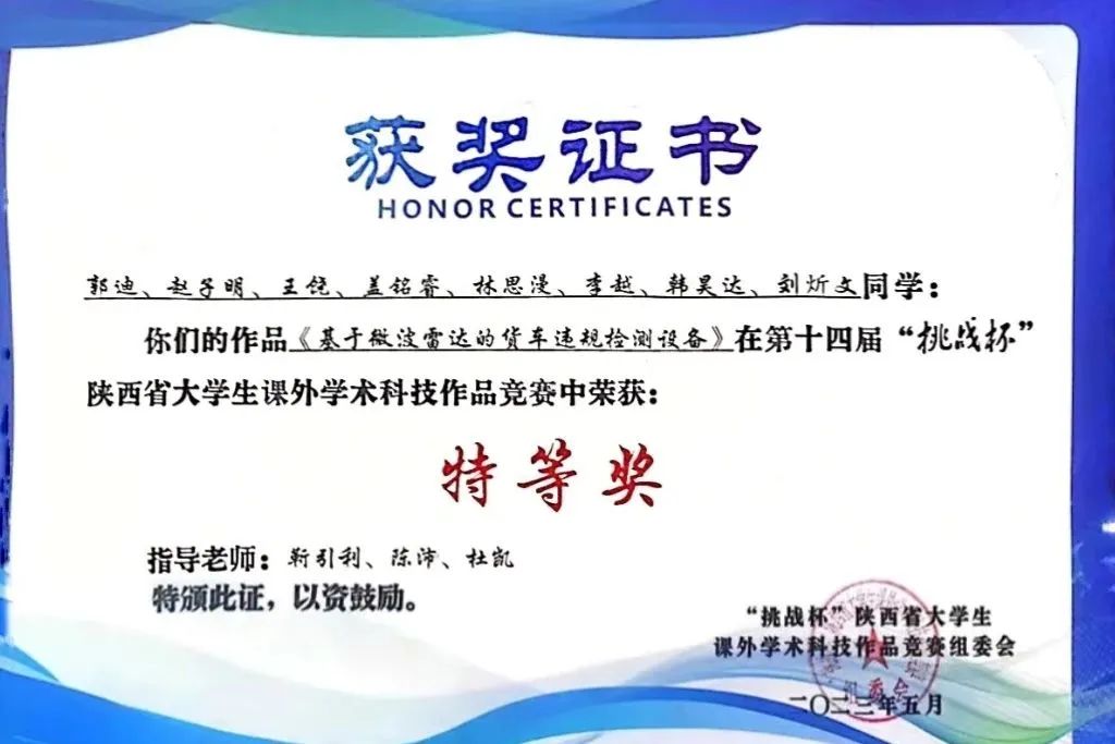 beat365英国官方网站积极响应团省委和校团委号召,广泛组织学生参与本届“挑战杯”竞赛。由学院靳引利教授指导、本科生郭迪、赵子明、王饶、盖铭睿、林思漫、李越、韩昊达、刘炘文同学完成的作品《基于微波雷达的货车违规检测设备》荣获第十四届“挑战杯”陕西省大学生课外学术科技作品竞赛特等奖,实现了学院在此项赛事上的历史性突破,团队成员赵子明同学代表学校在颁奖仪式现场进行路演展示。