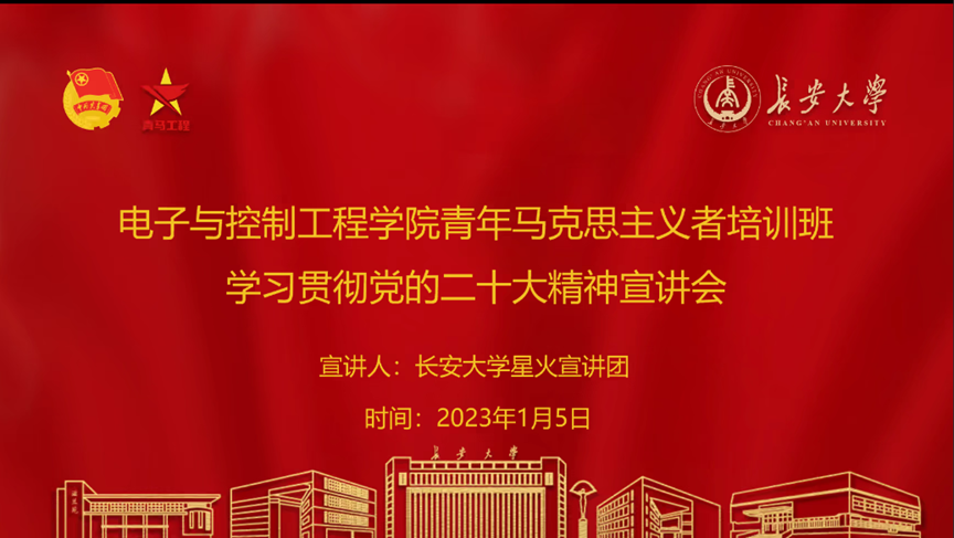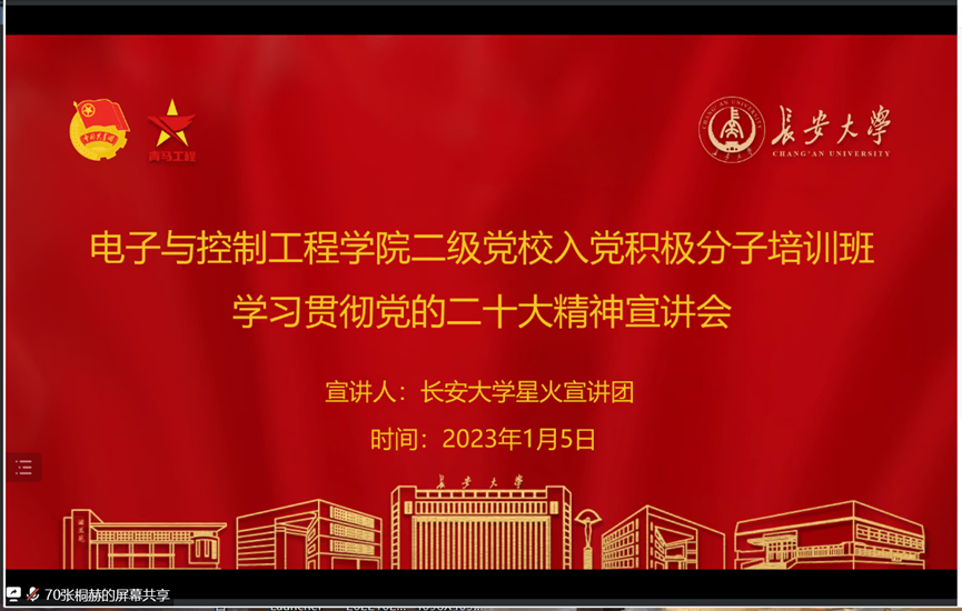 为深入学习贯彻党的二十大精神,增强广大学生爱党爱国信念,2023年1月5日上午10时,beat365英国官方网站以腾讯会议的形式举行二级党校入党积极分子培训班暨第十五期青年马克思主义者培训班学习贯彻党的二十大精神宣讲会。beat365英国官方网站党委副书记李阳、学工办主任高婷、团委书记王斌娟,团委副书记王博、许必颖、高朋举,辅导员张馨月出席会议,长安星火宣讲团、beat365官网各学生党支部党员、入党积极分子子、第十五期青马班全体学员参加本次会议,会议由青马班学员张桐赫主持。