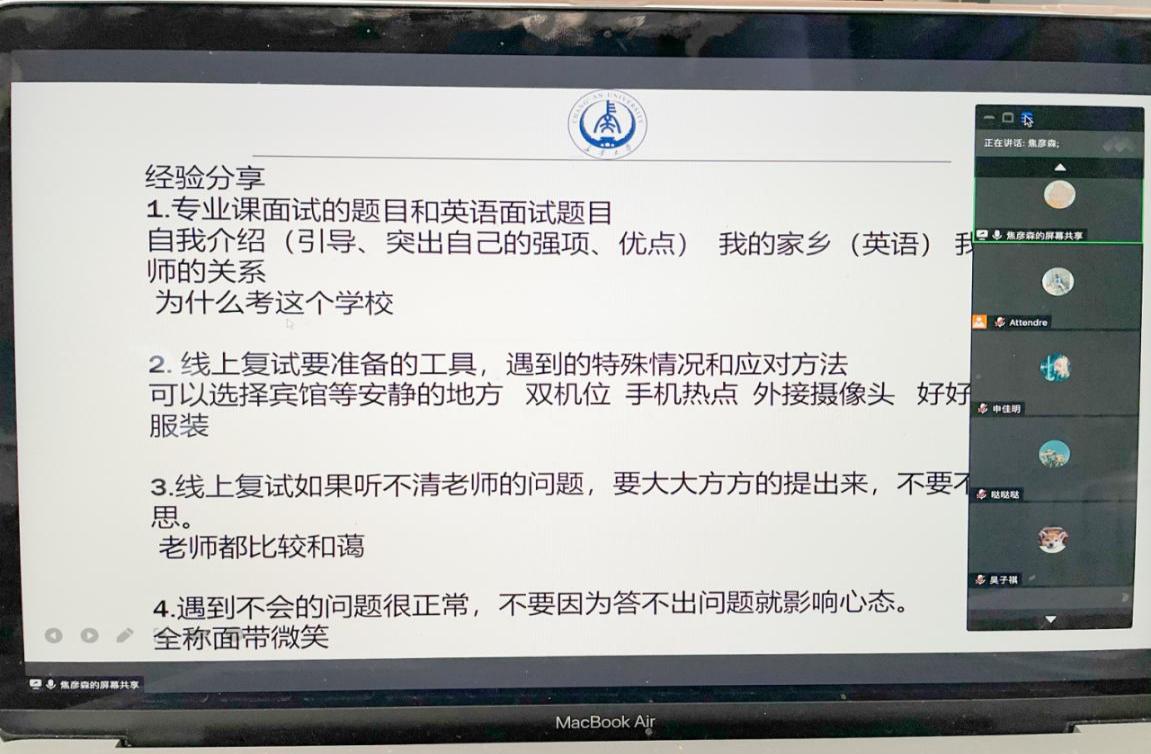 为进一步提升同学们在复试备考过程中的技巧和信心,3月7日,beat365英国官方网站在腾讯会议举办考研复试线上经验交流会,邀请9位优秀的在读硕士研究生为即将参加考研复试的同学做经验介绍。beat365英国官方网站学办主任高婷老师、2017级辅导员王博老师、2018级辅导员王世鑫老师以及全院准备考研复试和部分2018级同学参加此次经验交流会。交流会由辅导员王博老师主持。