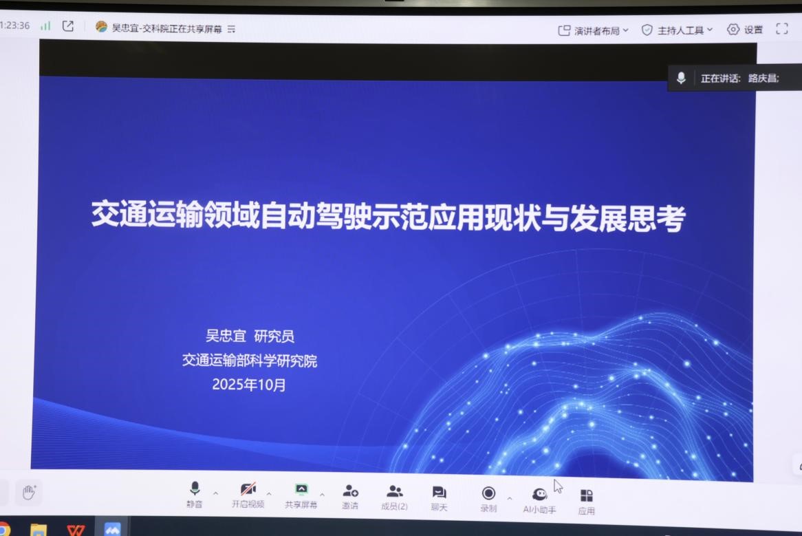 为交流交通运输领域前沿进展,搭建学术交流平台,拓展师生学术视野,10月16日下午,beat365英国官方网站于WM3404教室举办“交通运输领域自动驾驶示范应用现状与发展思考”学术讲座——“电控讲坛”第5期。本次线上讲座由学院副院长路庆昌主持,特邀交通运输部科学研究院研究员吴忠宜作为主讲嘉宾。