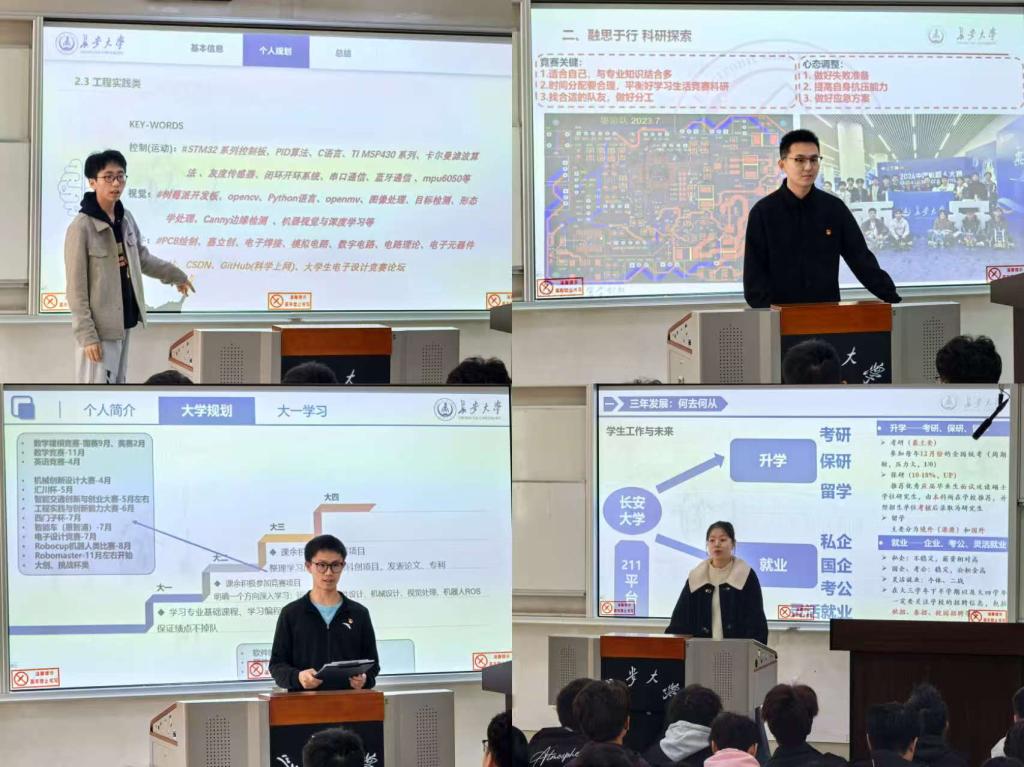 马帅从课程学习与时间管理入手,强调“课前预习+课后复盘”的高效学习模式;王恒结合参与赛事的经历,分享了从备赛到获奖的全过程,鼓励新生“敢于尝试、勇于坚持”;卢锦浩围绕学科竞赛与项目实践,提出“以赛促学、以练促用”的成长路径;吕尚蔚则从志愿服务与科创融合的角度,讲述了在机器人科普活动中的收获与感悟。