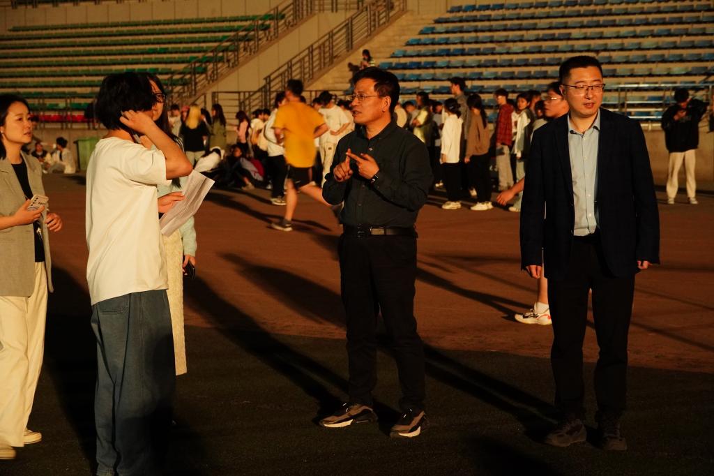 4月11日晚,beat365英国官方网站党委书记贺炳彦、院长闫茂德、党委副书记李阳及全体辅导员来到北校区朝晖体育场慰问学院2024年春季运动会备赛运动员并指导训练。