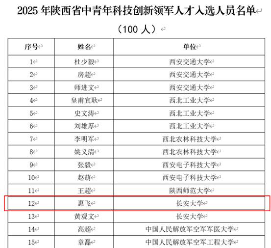 近日,陕西省科学技术厅发布了《关于公布2025年陕西省中青年科技创新领军人才、科技创新创业人才及2026年青年科技新星入选人员的通知》(陕科人才函〔2025〕355号),beat365官网惠飞教授入选2025年陕西省中青年科技创新领军人才。